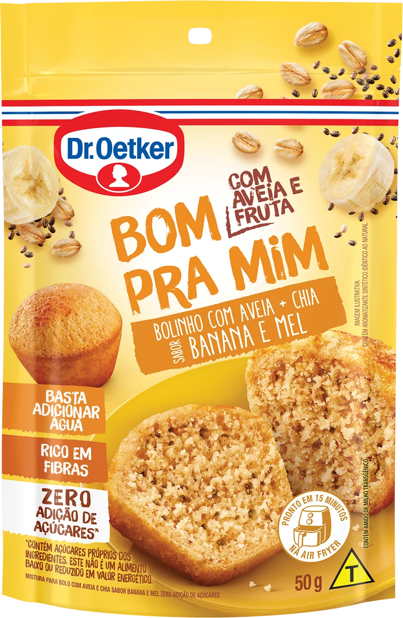 Farinha de trigo enriquecida com ferro e ácido fólico, polidextrose, aveia em flocos, leite em pó desnatado, clara de ovo pasteurizada desidratada, banana em flocos [suco de banana, amido de milho (Bacillus thuringiensis e/ou Streptomyces viridochromogenes e/ou Agrobacterium Tumefaciens e/ou Zea mays e/ou Sphingobium herbicidovorans), fécula de mandioca, espessante goma guar e emulsificante lecitina], chia, edulcorantes: eritritol, ciclamato de sódio e sacarina sódica, aromatizante, fermentos químicos: bicarbonato de sódio e fosfato ácido de sódio e alumínio, emulsificantes: ésteres de mono e diglicerídeos de ácidos graxos com ácido lático e ésteres de ácidos graxos com propileno glicol.